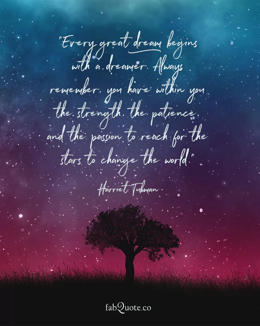 “Every great dream begins with a dreamer. Always remember, you have within you the strength, the patience, and the passion to reach for the stars to change the world.” Harriet Tubman