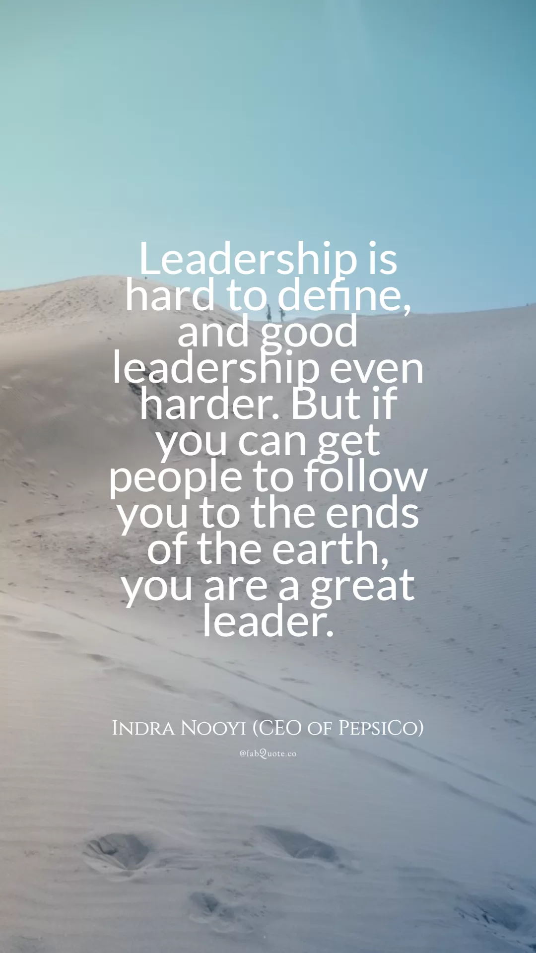 “Leadership is hard to define, and good leadership even harder. But if you can get people to follow you to the ends of the earth, you are a great leader.” Indra Nooyi (CEO of PepsiCo)