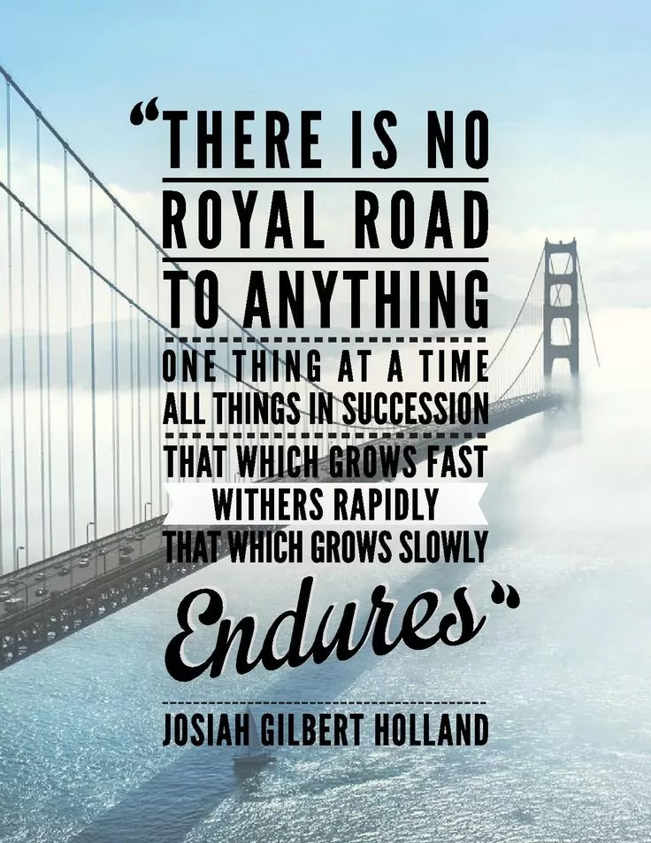 “There is no royal road to anything, one thing at a time, all things in succession. That which grows fast, withers as rapidly. That which grows slowly, endures.” Josiah Gilbert Holland