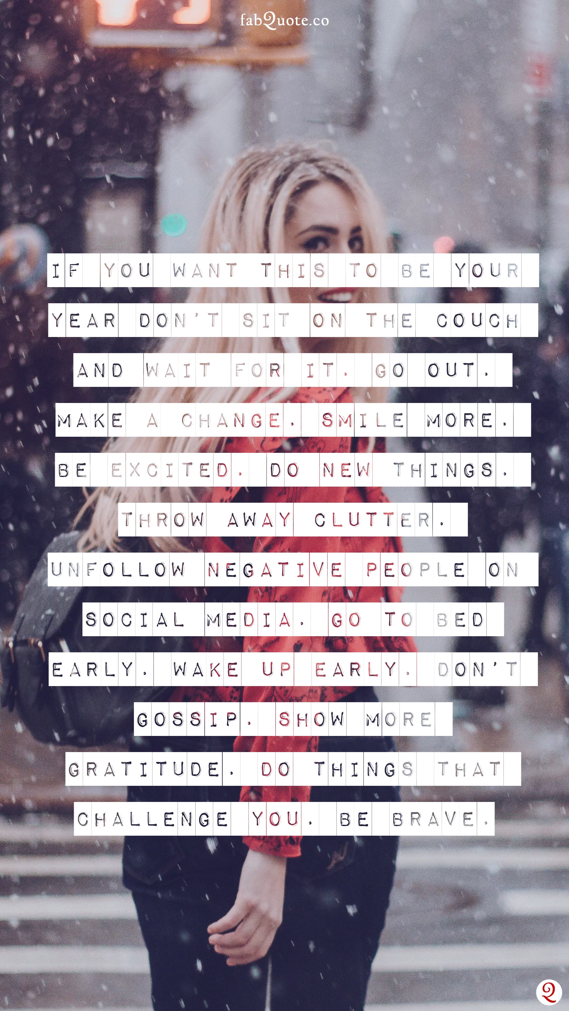 “If you want this to be your year, don’t sit on the couch and wait for it. Go out. MakeĀ change. Smile more. Be excited. Do new things. Throw away clutter. Unfollow negative people on social media. Go to bed early. Wake up early. Don’t gossip. Show more gratitude. Do things that challenge you. Be brave.”