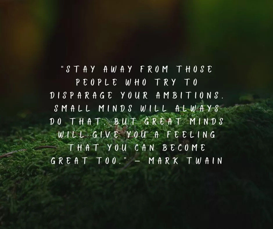 “Stay away from those people who try to disparage your ambitions. Small minds will always do that, but great minds will give you a feeling that you can become great too.” — Mark Twain