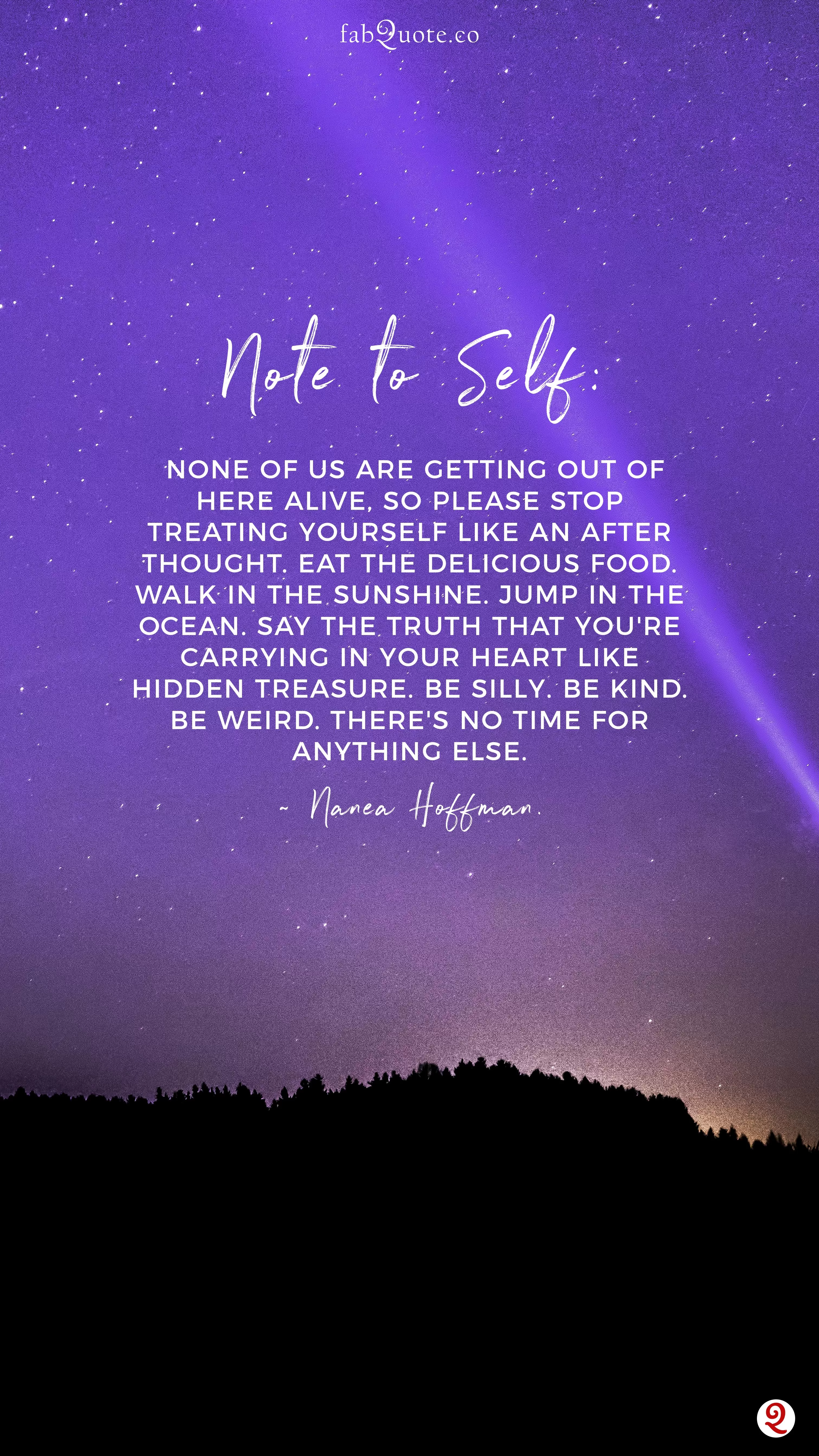 “Note to Self: None of us are getting out of here alive, so please stop treating yourself like an after thought. Eat the delicious food. Walk in the sunshine. Jump in the ocean. Say the truth that you’re carrying in your heart like hidden treasure. Be silly. Be kind. Be weird. There’s no time for anything else.” ~ Nanea Hoffman.
