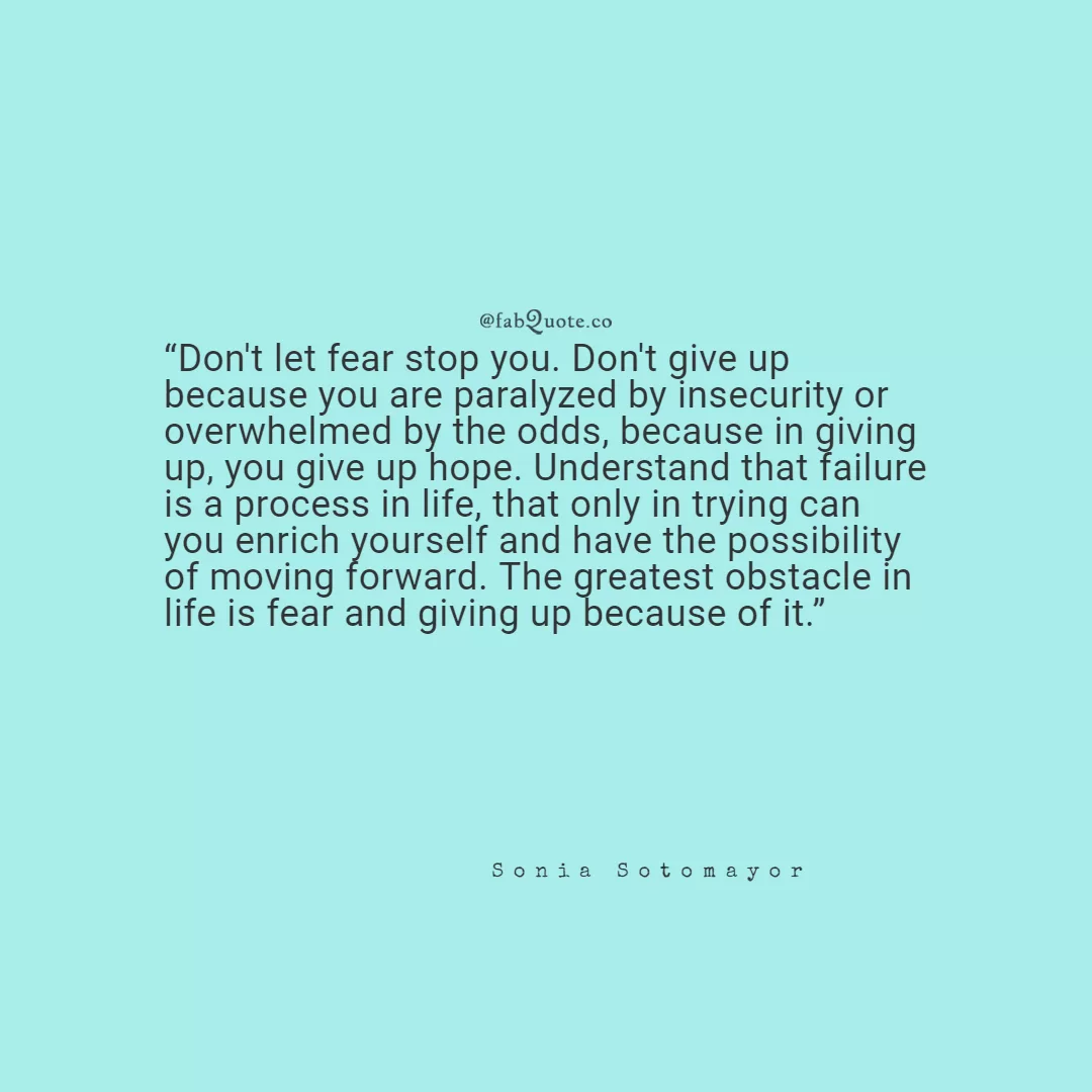 “Don’t let fear stop you. Don’t give up because you are paralyzed by insecurity or overwhelmed by the odds, because in giving up, you give up hope. Understand that failure is a process in life, that only in trying can you enrich yourself and have the possibility of moving forward. The greatest obstacle in life is fear and giving up because of it.” Sonia Sotomayor