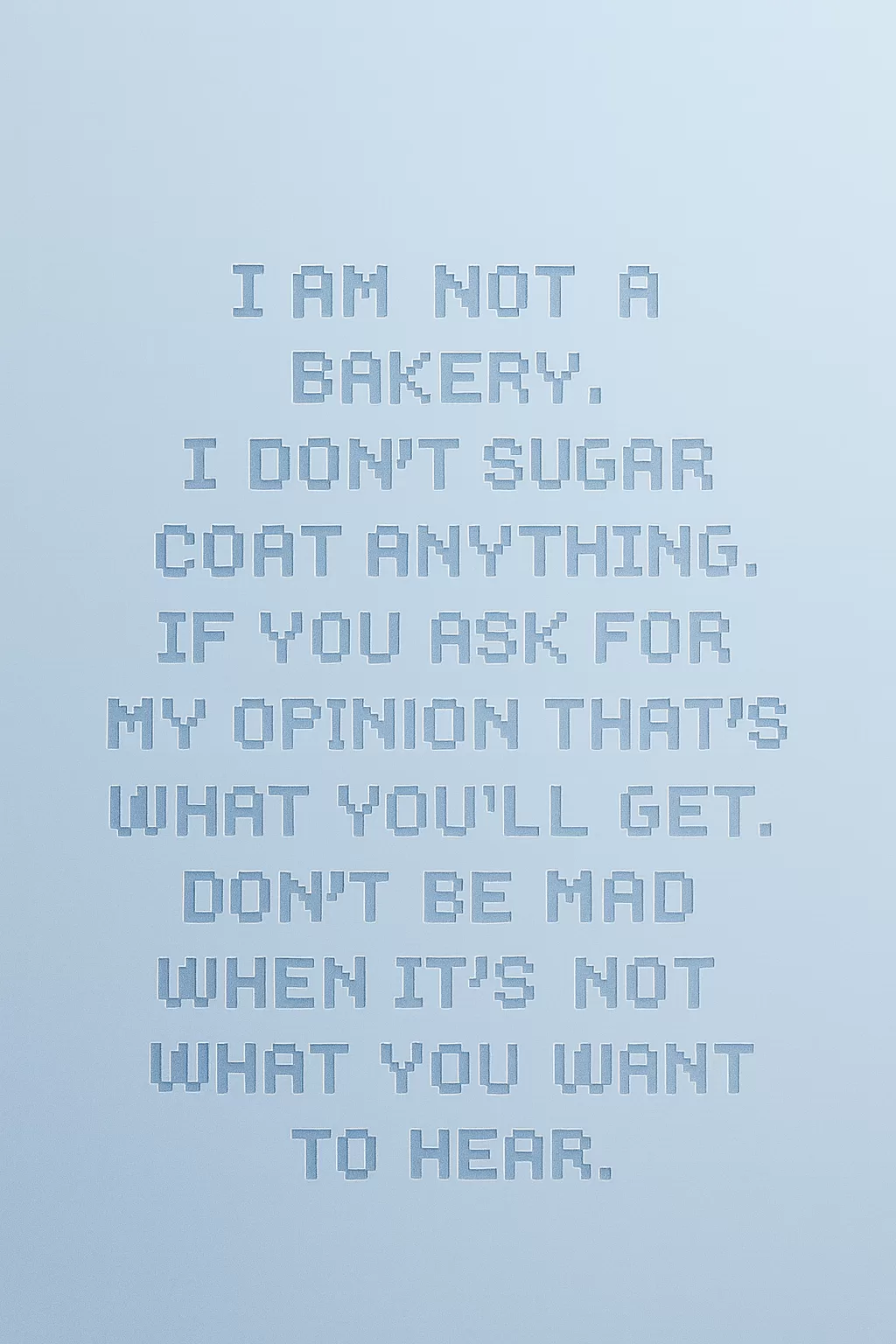 I am not a bakery. I don’t sugar coat anything. If you ask for my opinion that’s what you’ll get. Don’t be mad when it’s not what you want to hear.