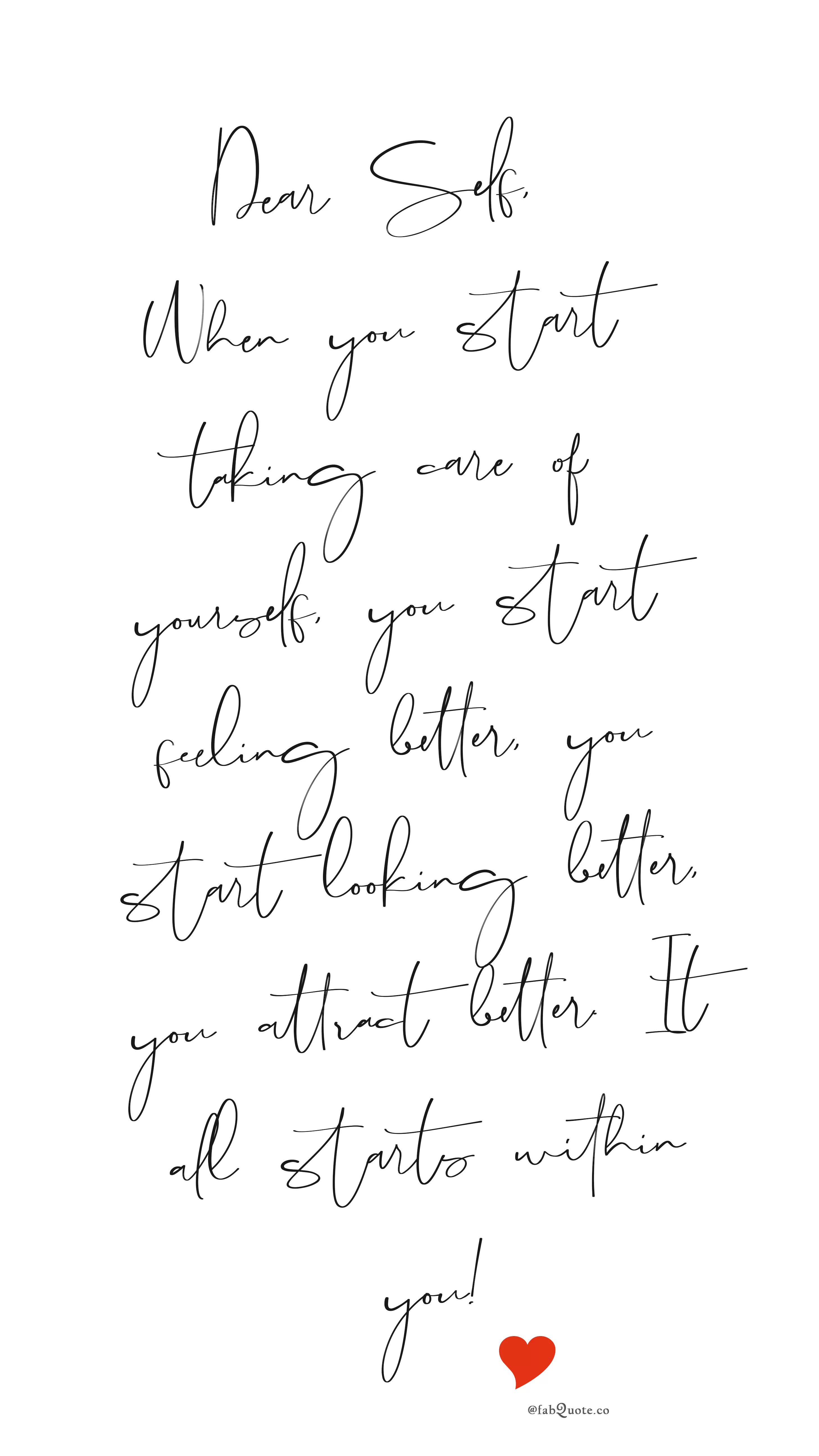 Dear Self, When you start taking care of yourself, you start feeling better, you start looking better, you attract better. It all starts within you!