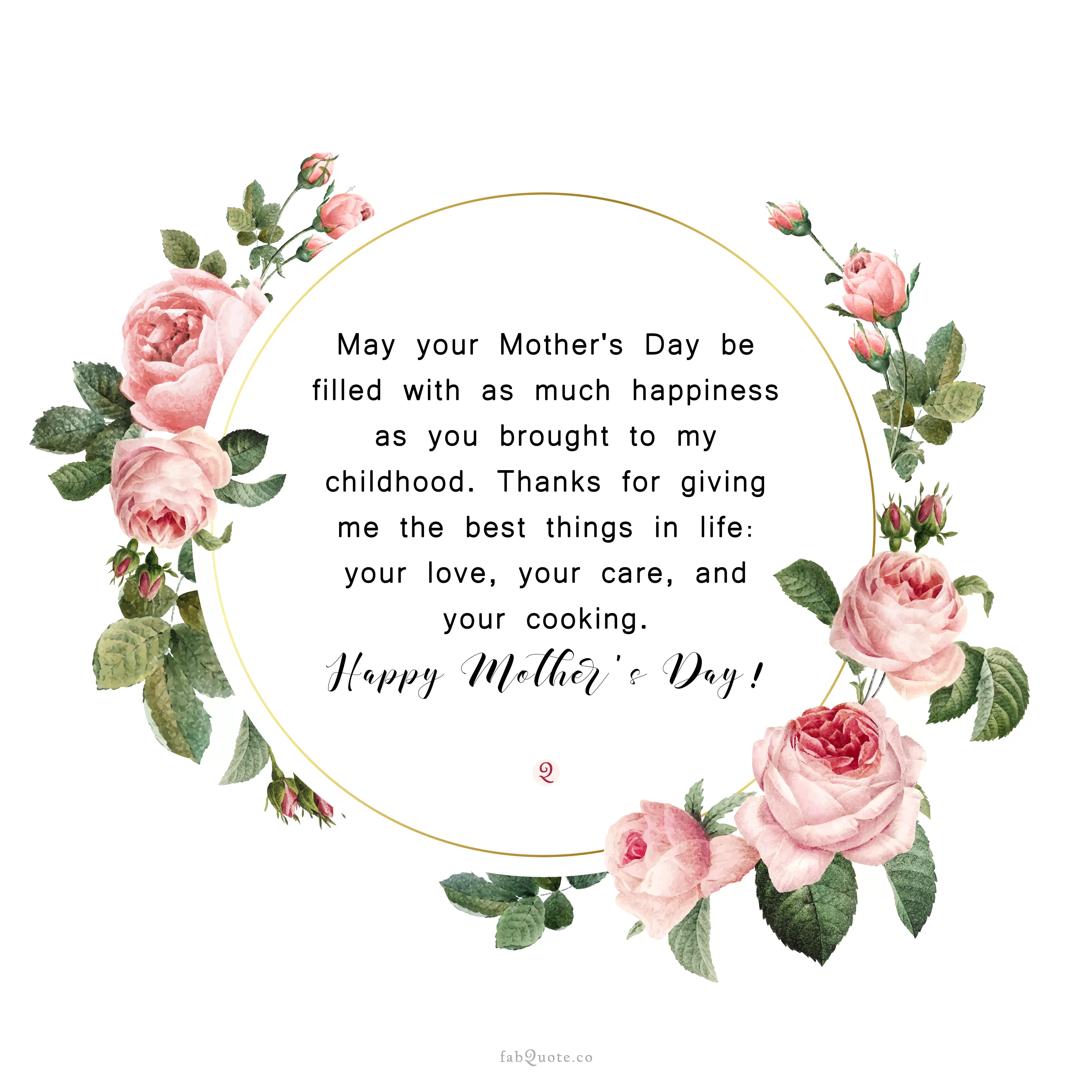 “May your Mother’s Day be filled with as much happiness as you brought to my childhood. Thanks for giving me the best things in life: Your love, your care, and your cooking. Happy Mother’s Day!”