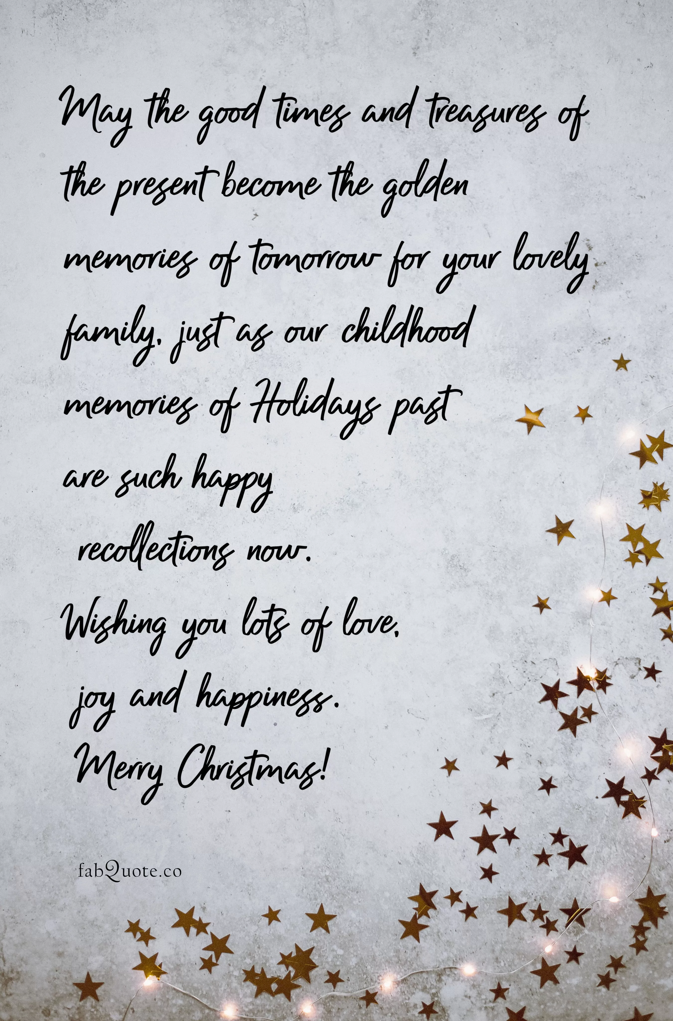 “May the good times and treasures of the present become the golden memories of tomorrow for your lovely family, just as our childhood memories of Holidays past are such happy recollections now. Wishing you lots of love, joy and happiness. Merry Christmas!”