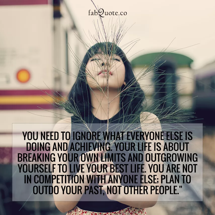 “You need to ignore what everyone else is doing and achieving. Your life is about breaking your own limits and outgrowing yourself to live YOUR best life. You are not in competition with anyone else; plan to outdo your past, not other people.”